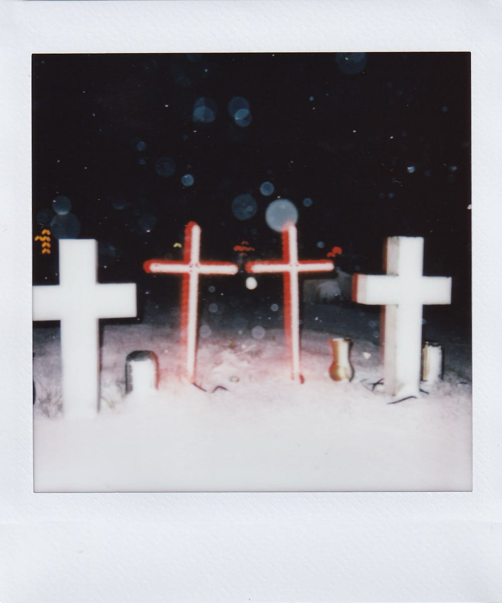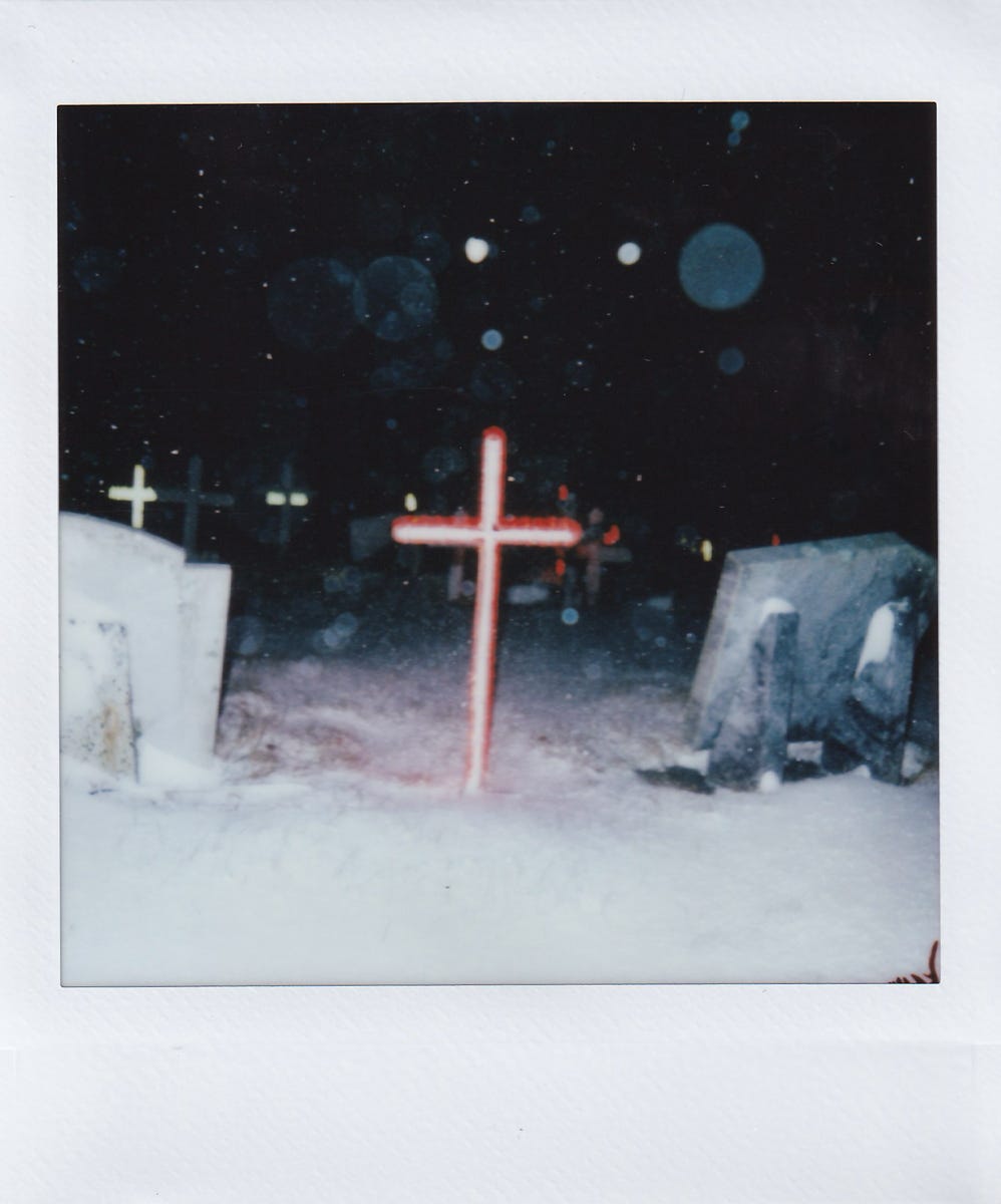 The cemetery was easy to find on the return trip. The tiny roads leading up to it were thick with snow, coming down hard and fast in the high winds. We even skidded on a turn at one point. Slow and steady was definitely the approach here. Strangely, this place felt even colder than Vik, and as soon as your gloves came off to try and take a photo, it was unbearable. I didn’t have high hopes of capturing anything in the blizzard, but surprisingly, I managed to get one of my favourite Instax shots ever. Who would’ve thought? You never know how these little square photos will turn out, and with it being well below freezing, I wondered if it was too cold for them to develop in my pocket, but I gave it a go!